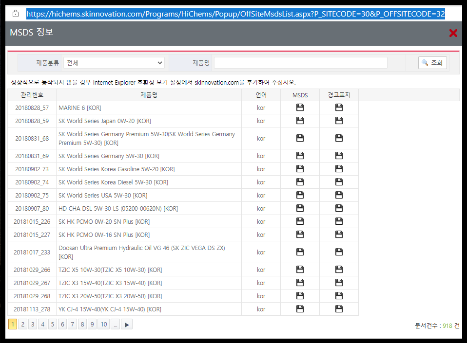 - SK루브리컨츠 회사 제품의 MSDS를 검색할 수 있는 사이트 화면: https://hichems.skinnovation.com/Programs/HiChems/Popup/OffSiteMsdsList.aspx?P_SITECODE=30&P_OFFSITECODE=32