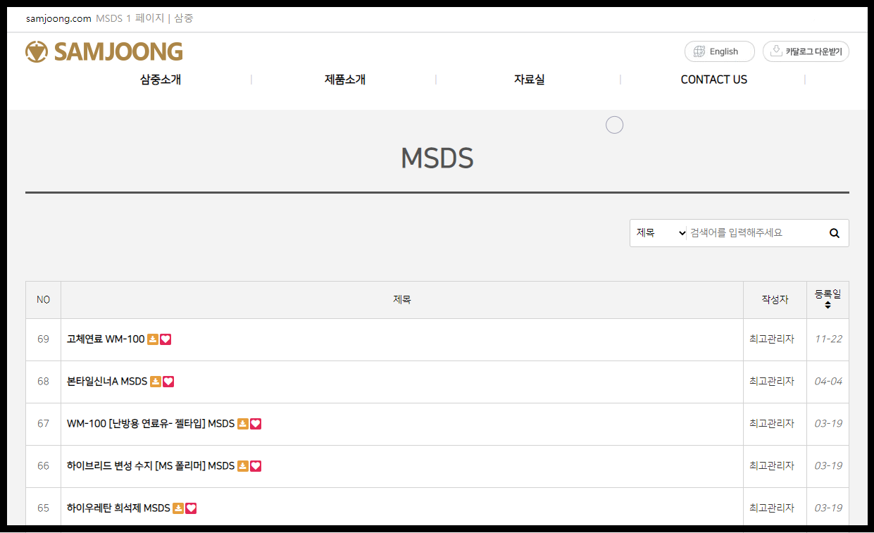 - 삼중 회사 제품의 MSDS를 검색할 수 있는 사이트 화면: http://www.samjoong.com/bbs/board.php?bo_table=msds