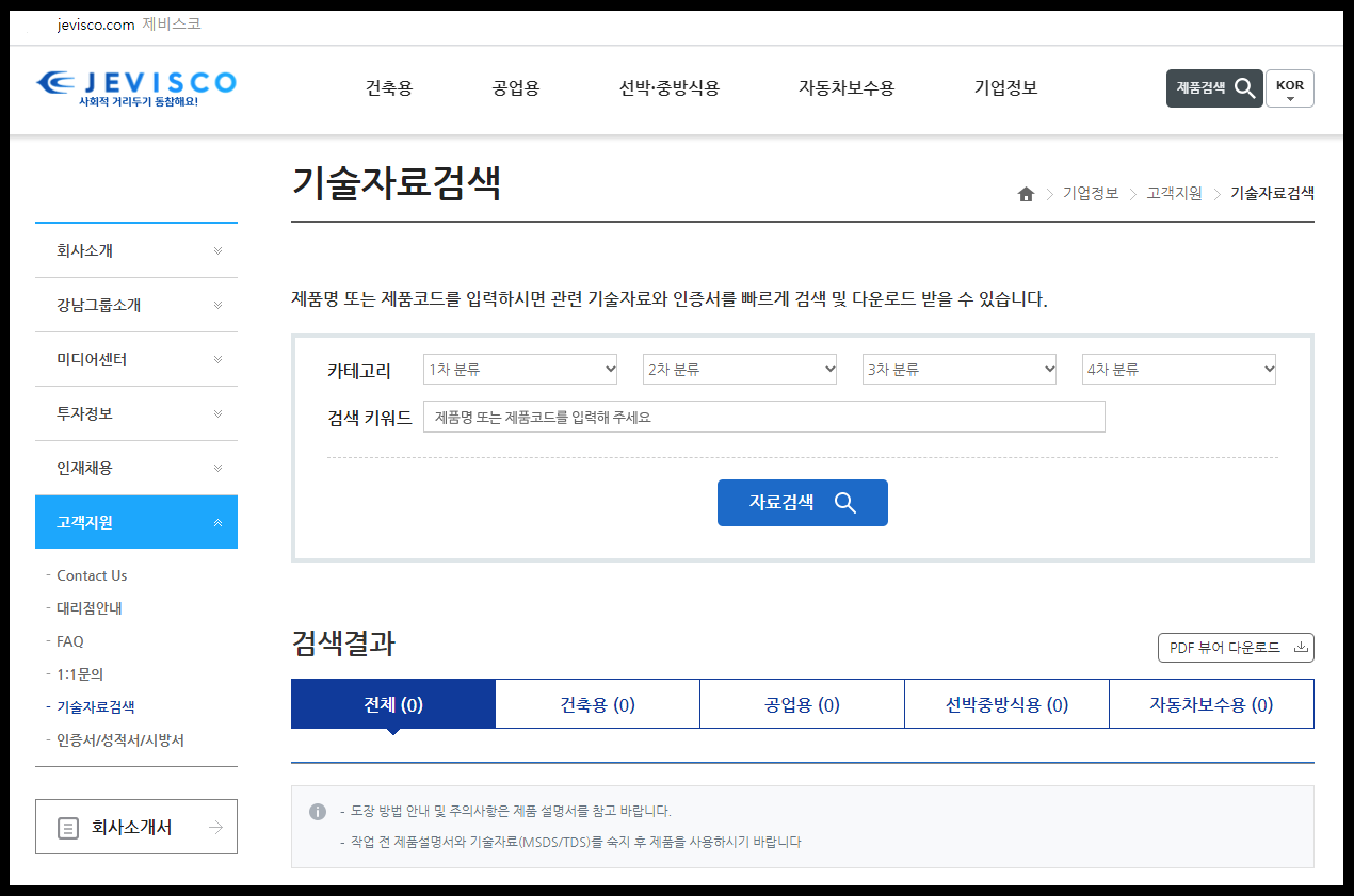 - 강남제비스코 MSDS를 검색할 수 있는 사이트 화면: http://www.jevisco.com/kr/information/support/search.do