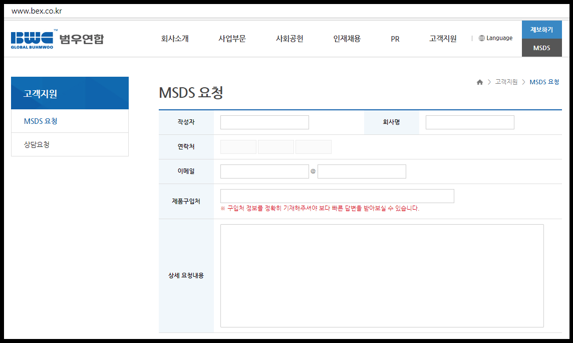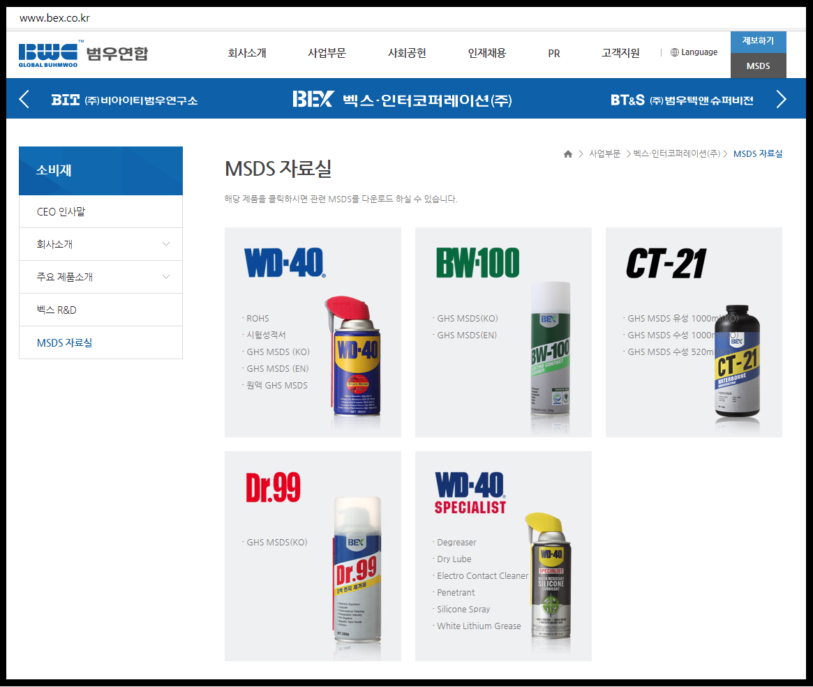 - 벡스인터코퍼레이션 회사 제품의 MSDS를 검색할 수 있는 사이트 화면: http://www.bex.co.kr/