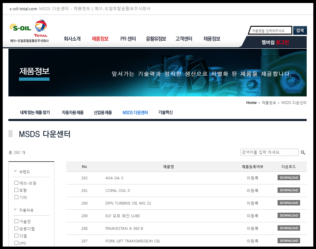- S-OIL(에쓰-오일토탈윤활유 주식회사) 제품의 MSDS를 검색할 수 있는 사이트 화면: http://www.s-oil-total.com/product/downloadCenter.do