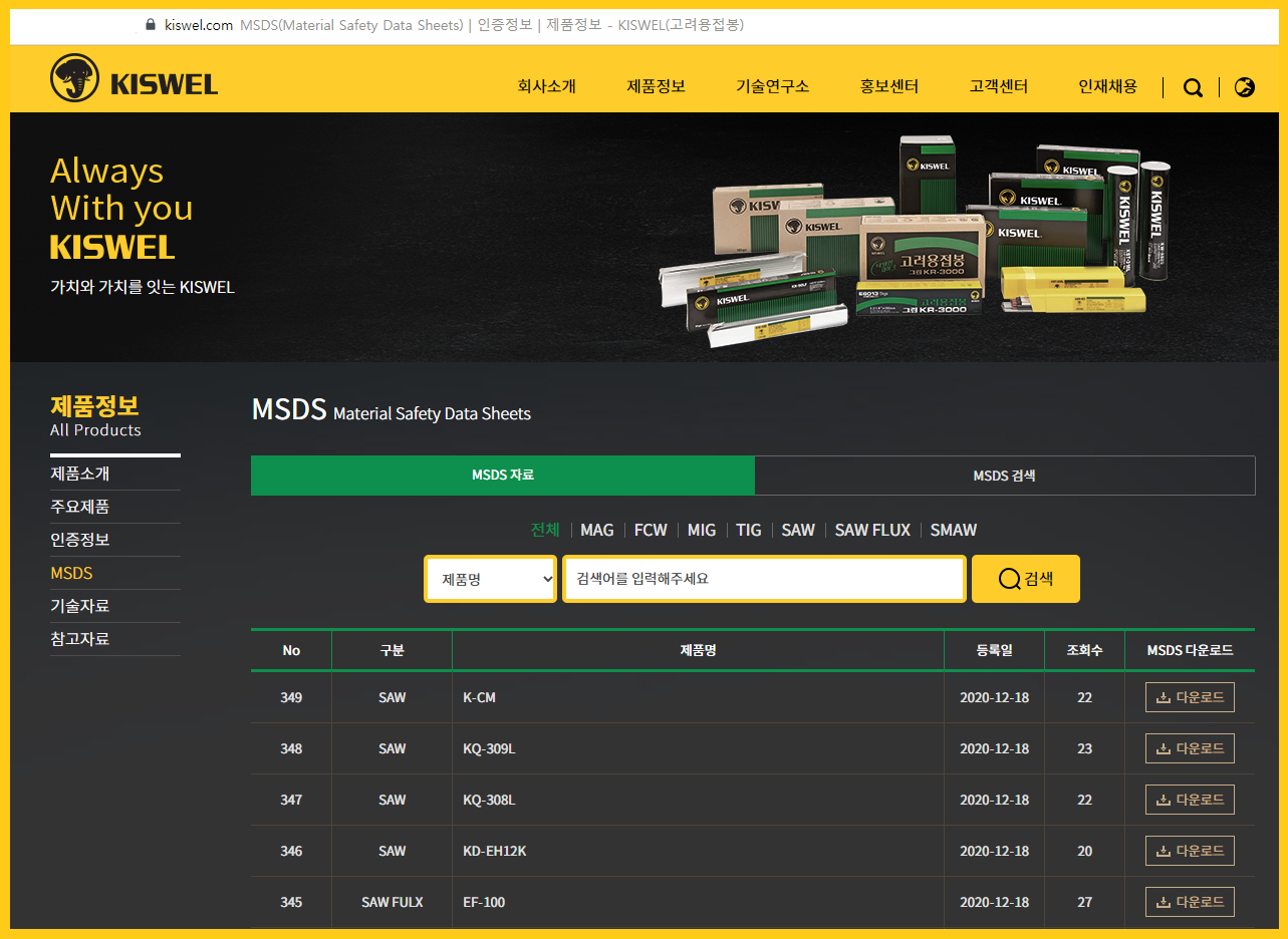 - 고려용접봉 회사 제품의 MSDS를 검색할 수 있는 사이트 화면: https://www.kiswel.com/product/mdms.asp