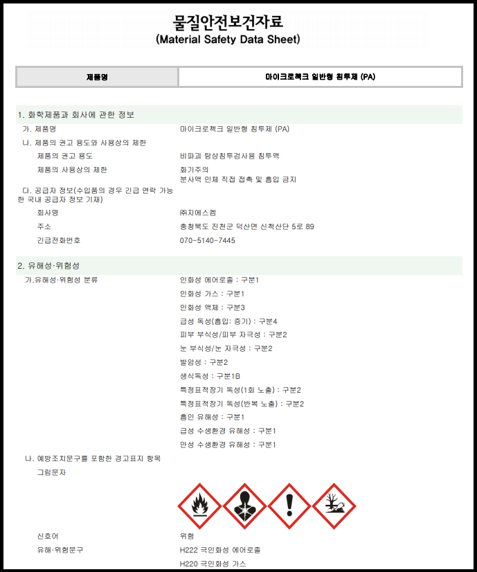 ▶ 2018.3.7.에 개정된 물질안전보건자료(MSDS)이며, 제조사 사이트에서 다운로드 가능합니다.