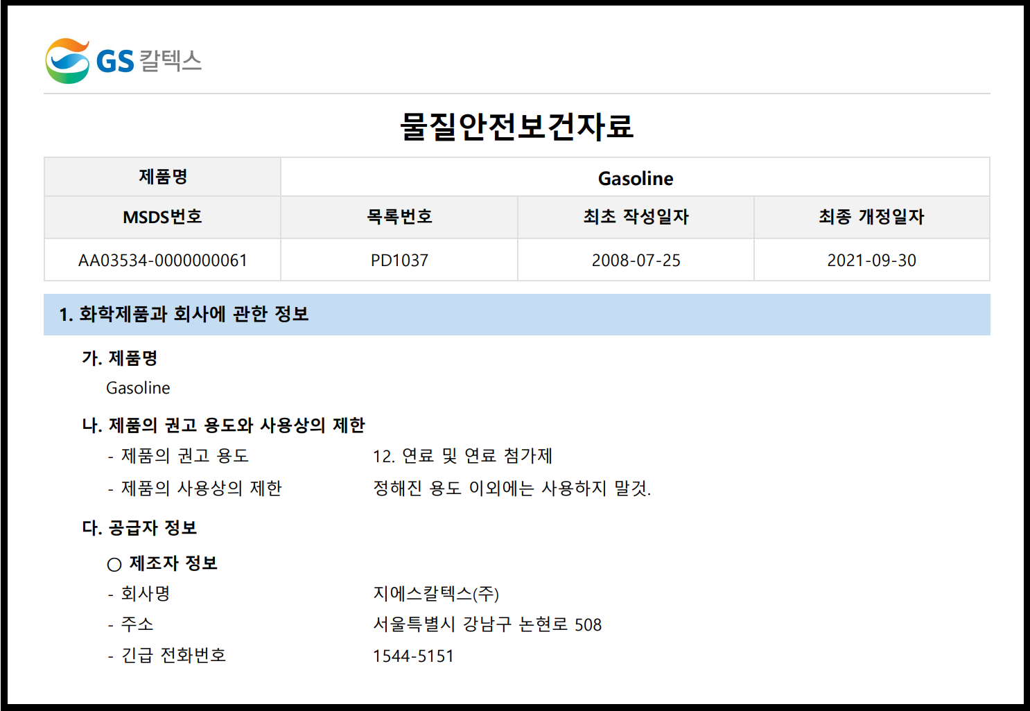 ▶ 2021.9.30.에 개정된 물질안전보건자료(MSDS)이며, 제조사 사이트에서 다운로드 가능합니다.