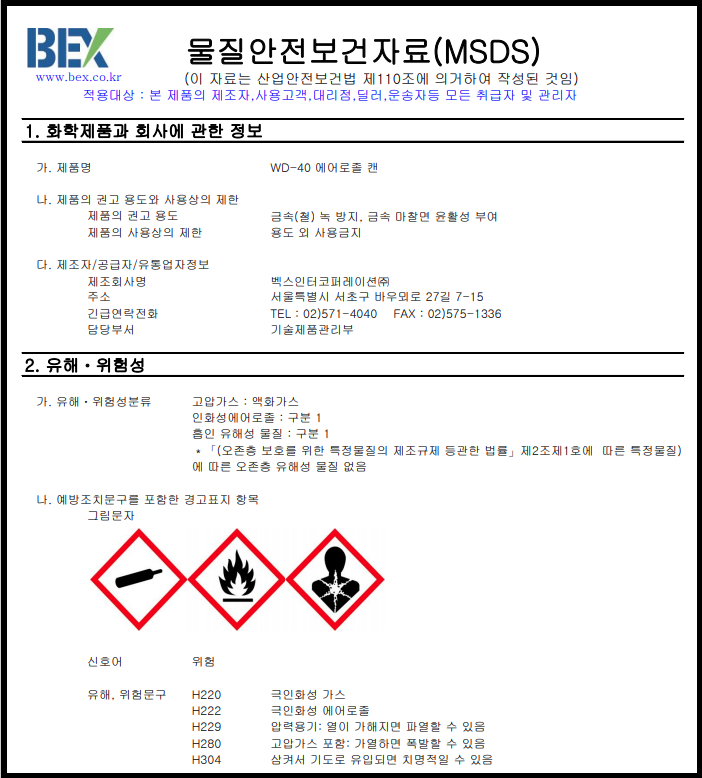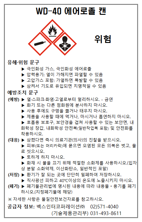 | BW-100(비더블유백) 에어로졸 캔 ▶ 작업공정별 관리요령, 경고표지, MSDS (0) | 2021.03.05 |