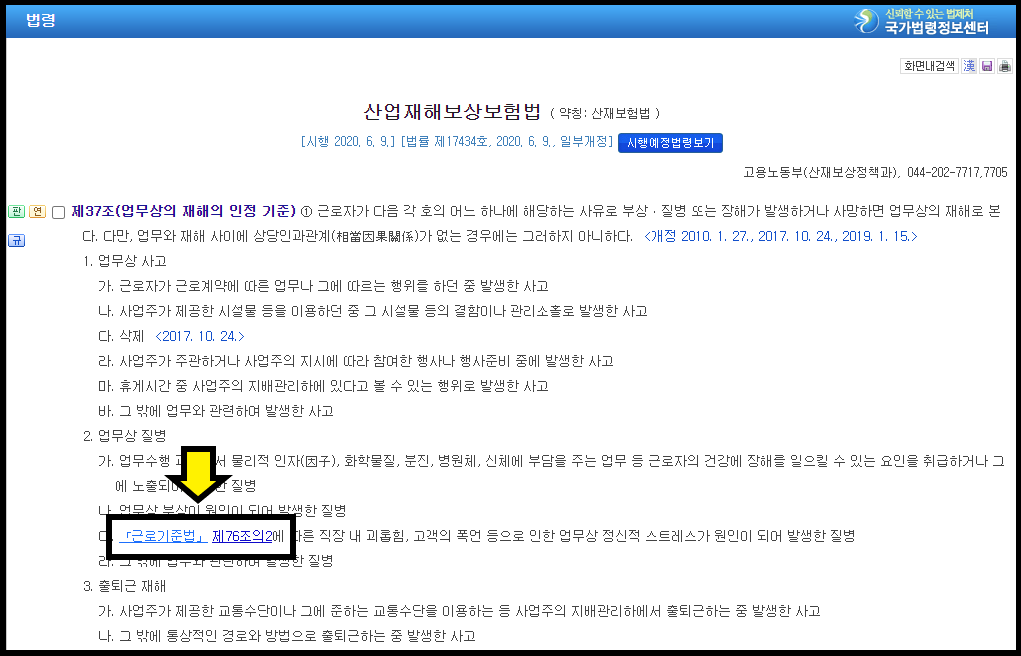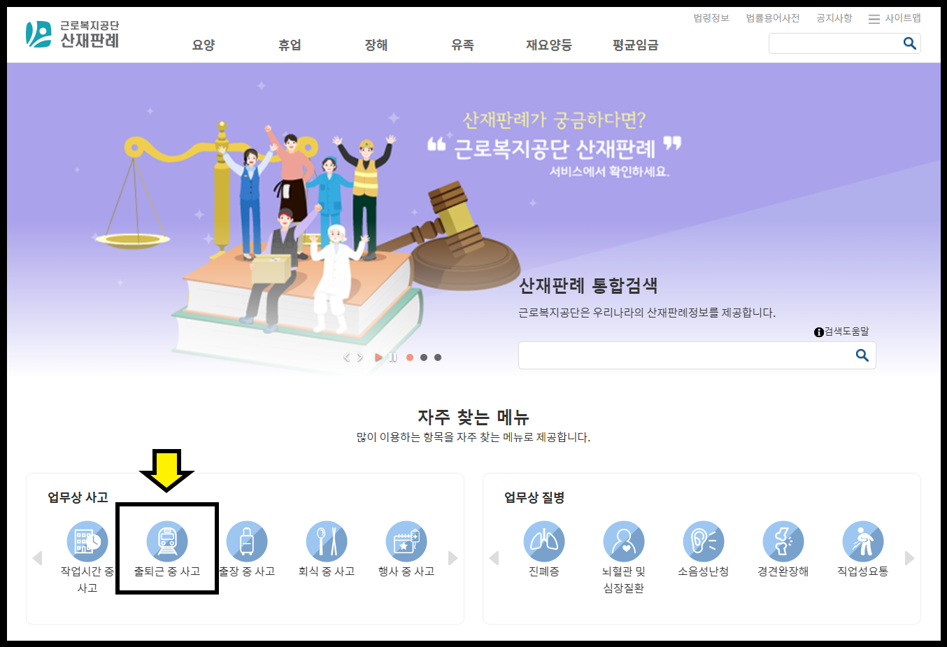 몇해 전 산재 인정 범위에 포함되어 이슈가 되었던 '출퇴근 중 사고'를 클릭해서 내용을 검색해봅니다.