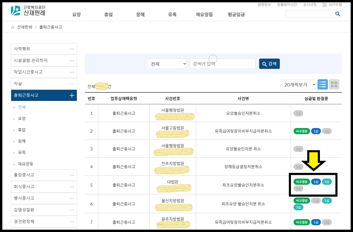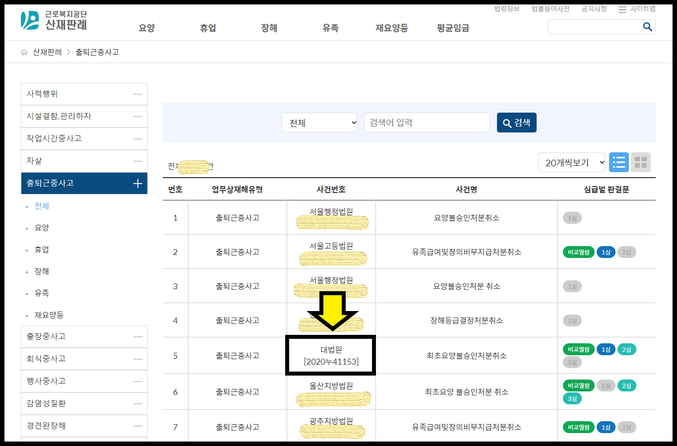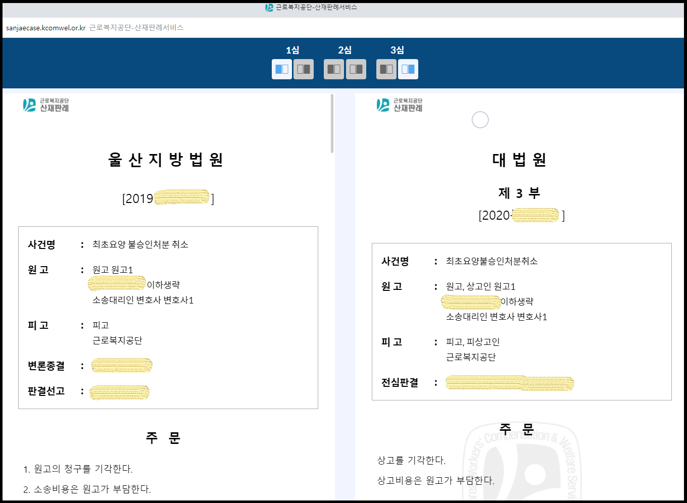 근로복지공단 산재판례 웹사이트에 접속하면, 근로복지공단이 보유중인 산재판결문을 조회할 수 있습니다.