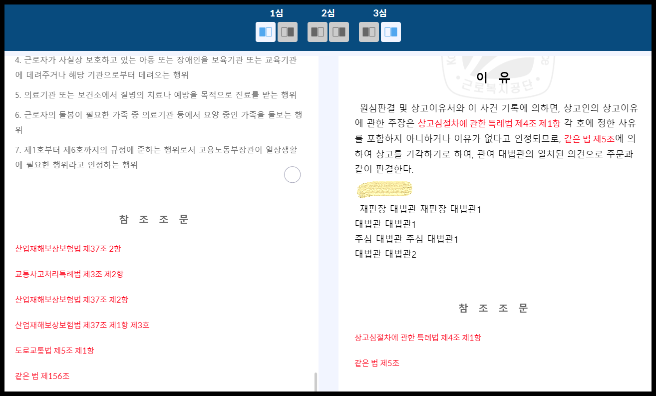 오른쪽에 1심, 2심, 3심, 비교열람을 누르면 팝업창으로 해당 판결문이 보여집니다.