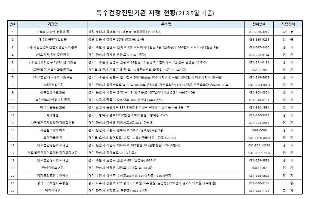 또한 특수건강진단 기관으로 지정받은 후 변동사항이 발생해 특수건강진단을 실시하지 않는 경우도 있으니, 사전 예약 후 방문하실 것을 권합니다.