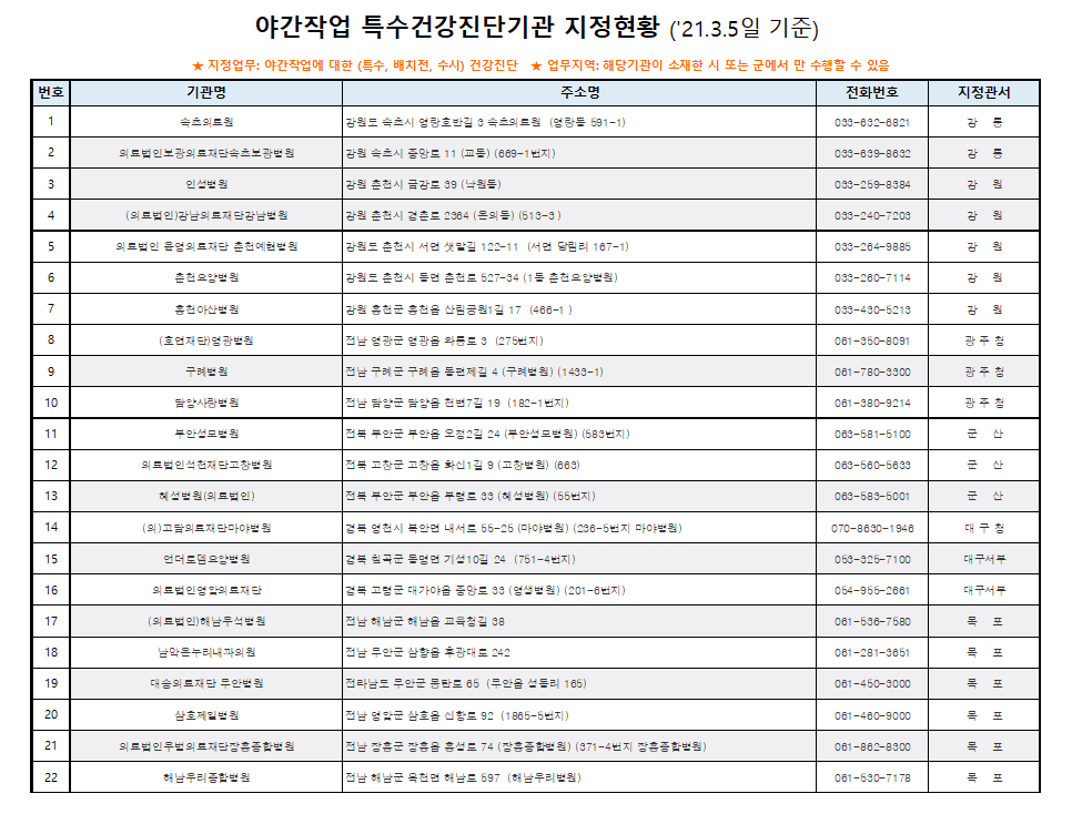 야간작업 특수건강진단 기관 지정 현황('21.3.5일 기준)