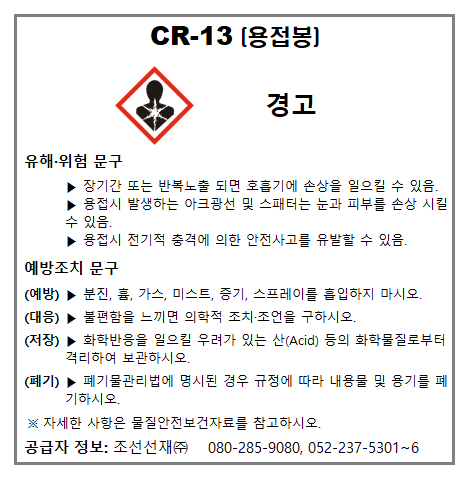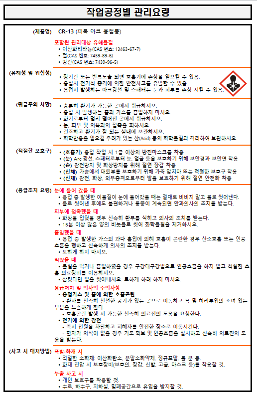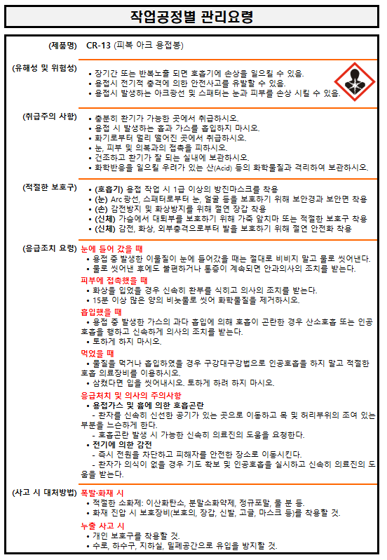 | (현대종합금속(주)) Supercored 110 ▶ 작업공정별 관리요령, 경고표지, 관리대상유해물질 게시, MSDS (0) | 2021.03.11 |